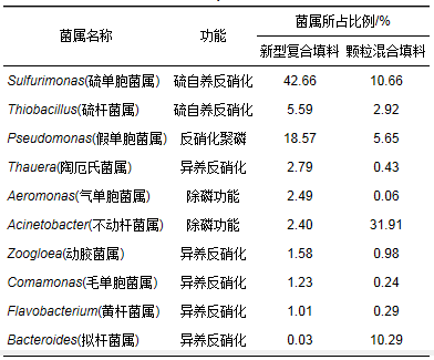 另外, 由表 2可見, 兩系統中與除磷作用有關的微生物有Pseudomonas、Aeromonas和Acinetobacter.從兩系統內具有除磷功能微生物的總量對比可以看出, 顆粒混合填料反應器內的生物除磷作用大于新型復合填料, 表明該系統內的生物除磷作用相對更多一些.同時根據2.2.2節的分析, 新型填料系統內的化學除磷作用相對更強, 這會使得系統內的總磷濃度得以迅速降低, 因此推測新型填料表面不動桿菌屬Acinetobacter的含量較小可能與之有關.此外, 兩系統內還存在著不同比例的可能具有反硝化聚磷功能的假單胞菌屬, 特別是新型填料, 這也在一定程度上提高了系統的脫氮除磷能力。