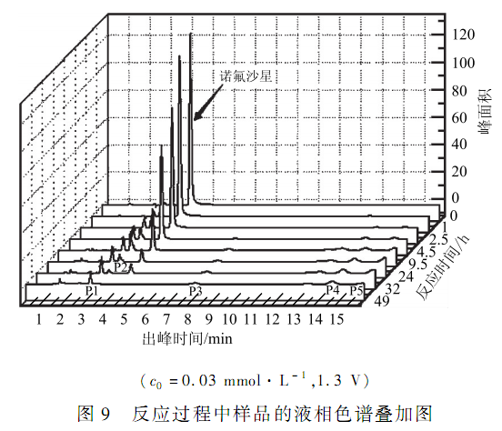 在反應的不同時刻,樣品的液相色譜疊加圖如圖 9 所示。 可知,除了 NOR 峰( 4. 520 min) 外,在3. 058、3. 411、8. 062、14. 510 和 15. 939 min,分別出現新的產物峰生成。 液相色譜-飛行時間質譜( LC-TOF)的檢測結果表明,這些產物的相對分子質量分別為 P1 (384 ) 、P2 (356 ) 、P3 (412 ) 、P4 (384 )和 P5(313) ,大于母體 NOR 的相對分子質量 319,可見,在 NOR 電化學降解過程中,可能發生了加成或絡合反應。 由于譜庫所限,相關產物的結構式有待進一步的研究。