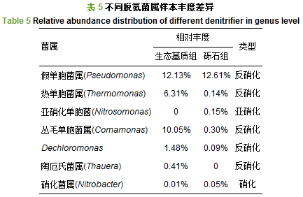 生態基質組和礫石組樣本中的假單胞菌屬(Pseudomonas)、熱單胞菌屬(Thermomonas)、亞硝化單胞菌(Nitrosomonas)、叢毛單胞菌屬(Comamonas)、Dechloromonas、陶厄氏菌屬(Thauera)、硝化菌屬(Nitrobacter)中均包含具有脫氮作用的菌種.以上脫氮菌屬在生態基質組和礫石組樣本中的相對豐度差異見表 5.由表 5可以看出, 生態基質組高通量樣本中具有亞硝化、硝化作用的菌屬相對豐度為0.01%, 具有反硝化作用的菌屬相對豐度為30.38%;礫石組樣本中具有亞硝化、硝化作用的菌屬相對豐度為0.2%, 具有反硝化作用的菌屬相對豐度為13.14%.