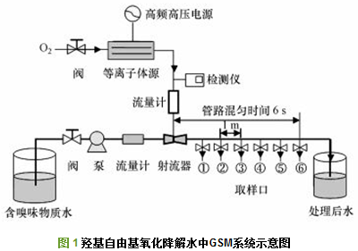 圖 1為羥基自由基氧化降解水中嗅味物質(zhì)GSM的實驗系統(tǒng)示意圖, 該系統(tǒng)主要采用大氣壓強電場電離放電結合水力射流空化方式制備·OH, 并對水中一定濃度的GSM進行氧化降解.簡單地說, 綠色自然物質(zhì)O2經(jīng)減壓閥調(diào)節(jié)流量后輸入等離子體源中, 與窄間隙、強電場中的高能、高密度電子發(fā)生非彈性碰撞, O2受電子激勵后發(fā)生電離、分解、重組形成O2+、O(1D)、O、O2(a1Δg)、O2-、O3等高濃度氧活性粒子.這些氣相中的氧活性粒子由檢測器在線實時顯示濃度后, 經(jīng)流量計注入到射流器中, 在水力射流空化作用下, 氧活性粒子與水分子發(fā)生等離子體化學反應生成·OH、HO2-、O2·-、O3·-、HO3·、H2O2等氧活性粒子溶液, 水中氧活性粒子的總濃度表示為總氧化劑(Total reactive oxidants, TRO) , 其濃度值由氣體放電總功率和氧氣流量調(diào)節(jié)控制.水泵將含有不同濃度的嗅味物質(zhì)GSM水樣經(jīng)流量計輸入射流器, 與生成的氧活性粒子溶液進行混勻, 同時發(fā)生氧化降解反應.管路中接觸反應時間為6 s, 圖中1~6取樣口的反應時間間隔為1 s.