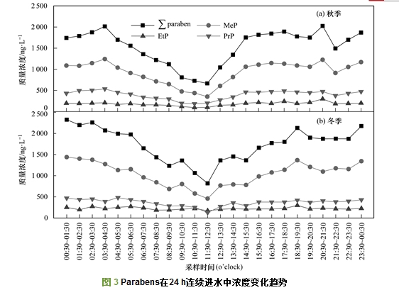 通過對秋冬兩季城市污水處理廠24 h的進水進行分析, 對parabens質量濃度的日變化趨勢進行了深入研究, 結果如圖 3所示.從中可以看出, 秋冬兩季主要目標物和總parabens質量濃度的日變化規律均相同, 24 h的質量濃度存在較大的變化, 秋冬兩季質量濃度最低值都出現在11:30~12:30之間, 此時秋冬季parabens的總質量濃度分別為664ng·L-1和819ng·L-1; 秋冬季質量濃度最高點分別出現在晚間20:30~21:30之間和凌晨00:30~01:30之間, 此時parabens的質量濃度分別為2 030ng·L-1和2 330ng·L-1, 分別是最低質量濃度的3.05倍和2.84倍, 由此可知秋冬季節進水中parabens的最高排放時期有一定的差異, 但是秋冬季節的日變化趨勢差異不大.污水中parabens的質量濃度日變化趨勢與污水廠覆蓋區域人們的日常生活有關, 如洗漱活動, 但是污水從居民家的排放到污水處理廠需要一定的時間.從圖 3中可以看出, 無論是秋季還是冬季, parabens質量濃度較低的時間大概有8~9 h, 正好與人們日常生活中的睡覺時間保持一致, 也證明了城市污水中parabens的污染主要是人們的日常生活導致的.本文對24 h進水中parabens的質量濃度日變化趨勢的研究結果為城市污水處理系統研究提供了重要參考, 特別是對水樣的采集時間的合理設置提供了參考.因此, 在進行城市污水處理廠運行效果的相關研究中, 針對進水的采集, 最好采集不同時間段的水樣進行混合, 否則可能由于單次采樣帶來較大誤差, 例如可以在24 h內, 每隔幾個小時進行一次水樣采樣, 然后混合為一個樣品, 或者根據24 h內污染物濃度的日變化趨勢, 選擇濃度的高峰或者低峰為節點, 按照污水處理廠各個污水處理單元的水力停留時間進行采樣.