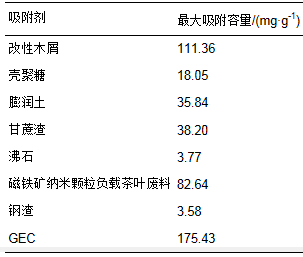 表 3中列出了本研究和近幾年已經報道過的吸附劑對剛果紅的最大吸附量.從表中可以看出,本研究中制備的吸附劑GEC對剛果紅的最大吸附量比其他許多吸附劑的最大吸附量高,說明GEC適合作為一種吸附劑去除水中剛果紅.